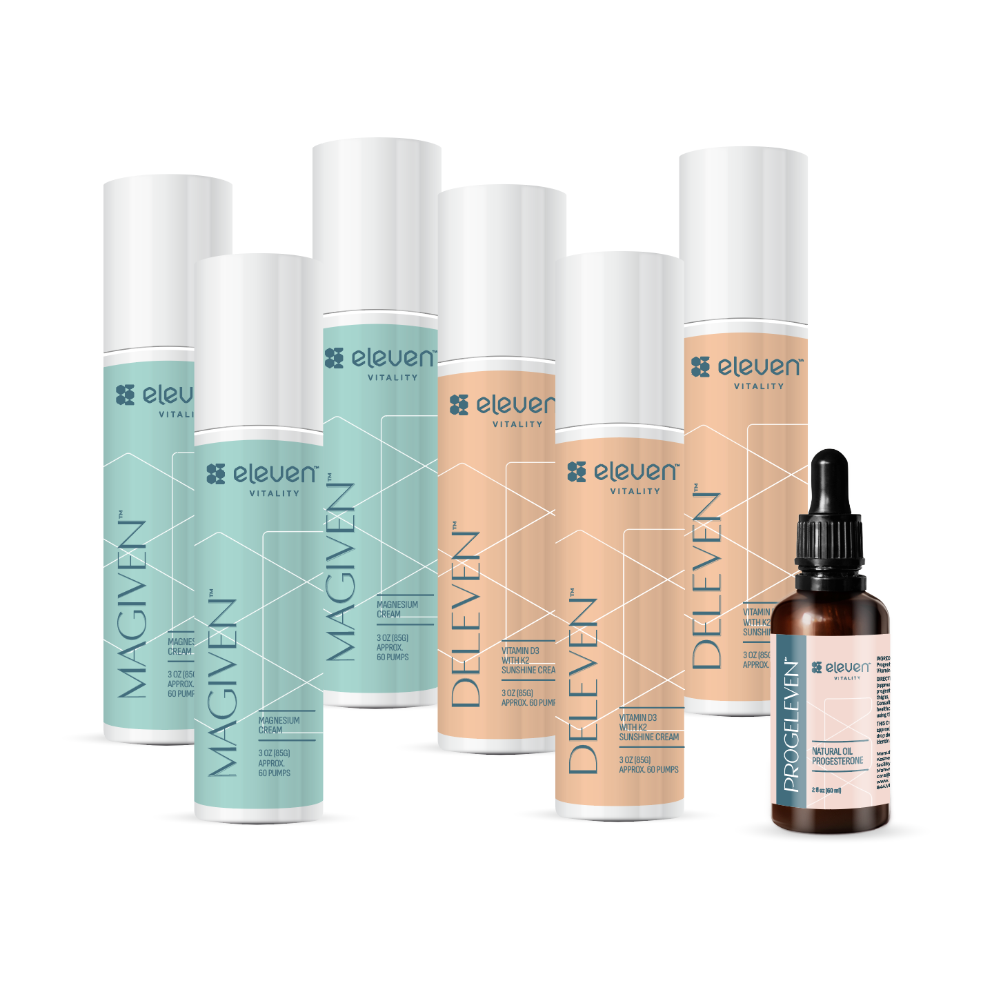 This comprehensive system includes 1 Progeleven Oil, 3 Magiven creams, and 3 Deleven creams, providing a complete 6-month supply designed for consistent, long-term support.